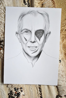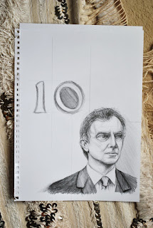 The second image is supposed to be a depiction of Blair reaching the end of his role as Prime Minister and leaving. Aside from my efforts to draw Blair in the most realistic way, I feel that the man in the illustration doesn't look enough like Tony Blair, and therefore maybe needs refining in later development. I could've (or still could) take the time to turn this drawing in to an Iain McArthur or T.S Abe style illustration where there is a slight elegant decorative touch that can aid the depiction of a flag, event or any other kind of symbolism in the background.